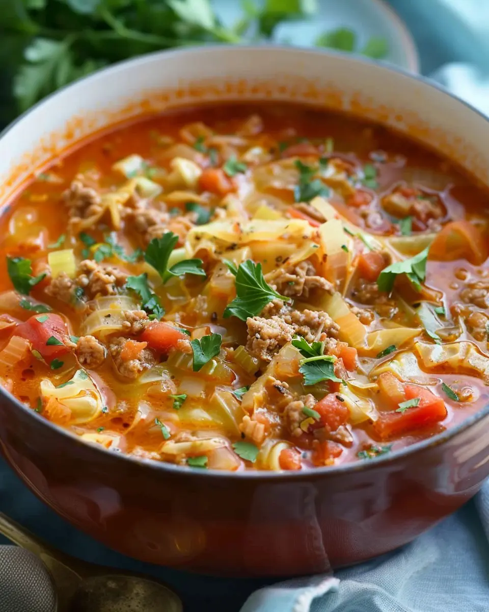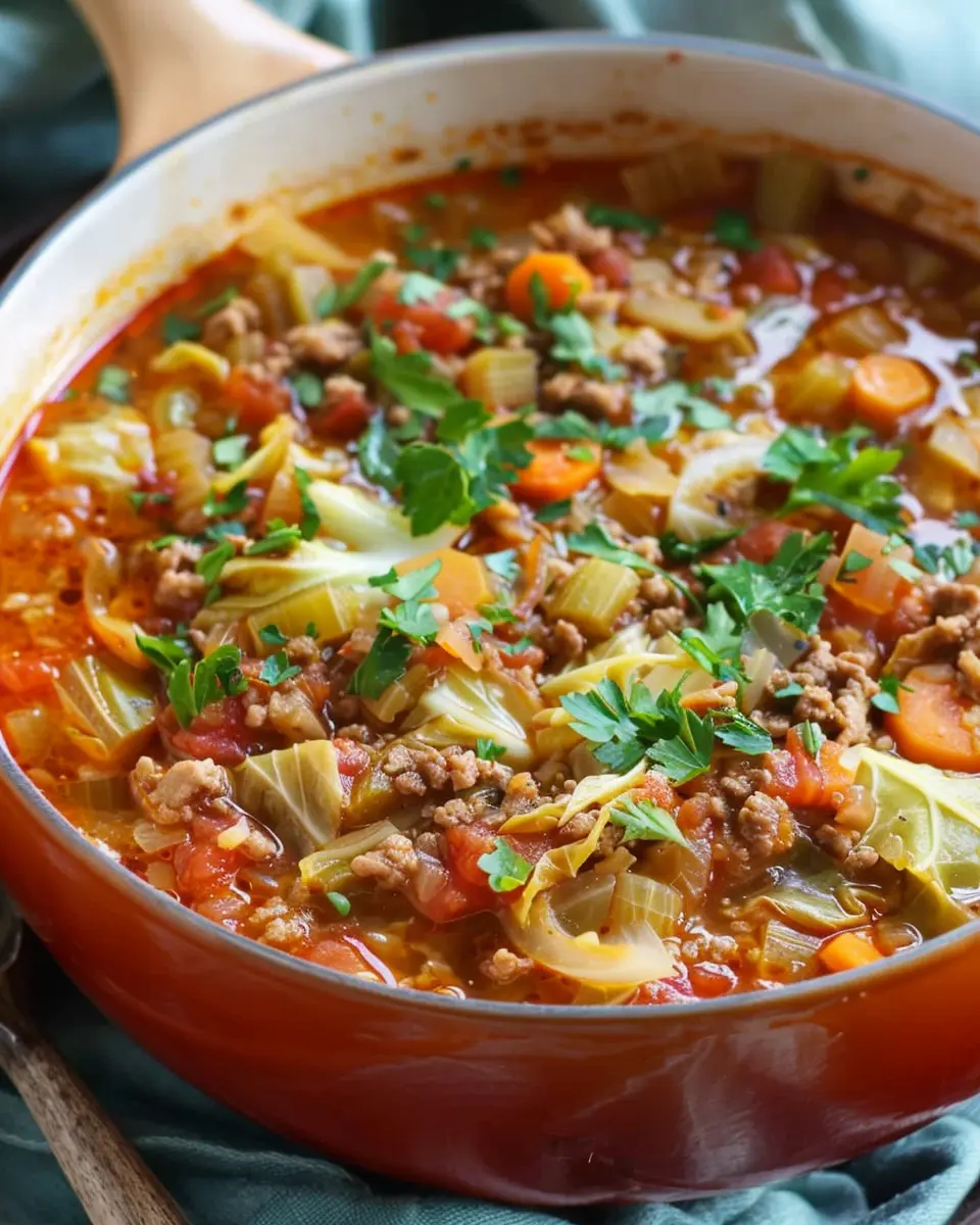 A hearty and comforting soup that combines the flavors of traditional cabbage rolls in a warm, delicious broth.