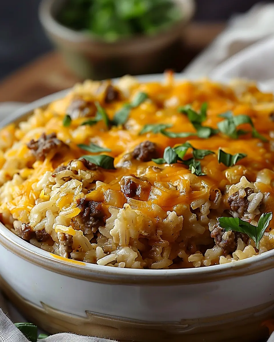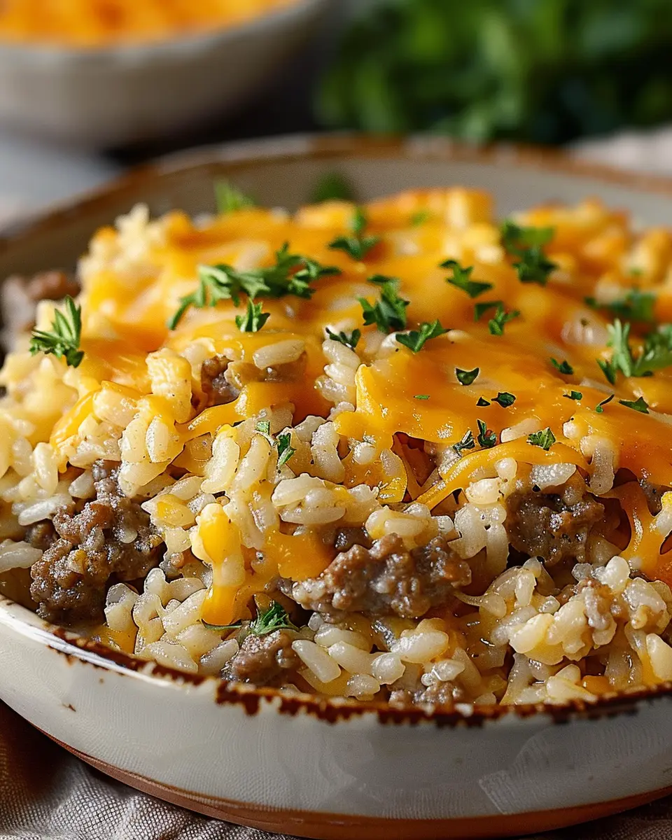 This delicious and easy Cheesy Hamburger Rice Casserole combines hearty flavors, making it a perfect comfort food dish for any occasion.