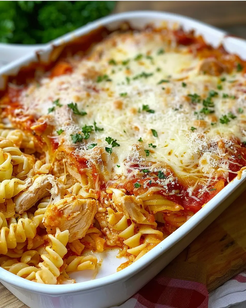 This Chicken Parmesan & Pasta Casserole is a deliciously easy comfort food dish that combines tender chicken, cheesy pasta, and a rich tomato sauce.