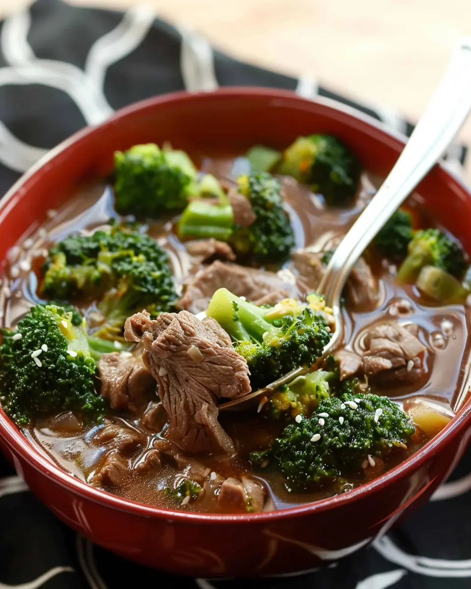 A delicious and comforting soup featuring tender beef and fresh broccoli in a savory broth.
