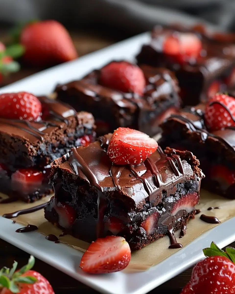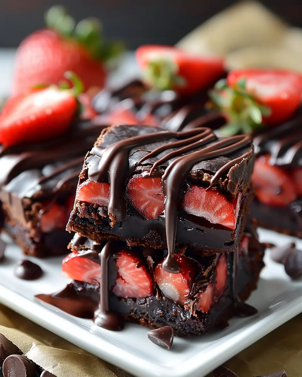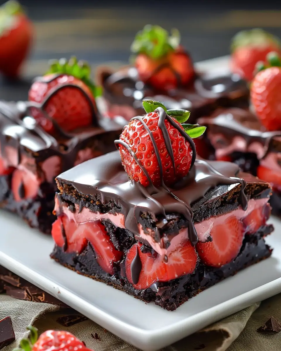 A delectable combination of rich chocolate brownies topped with fresh strawberries and chocolate ganache, perfect for any occasion.