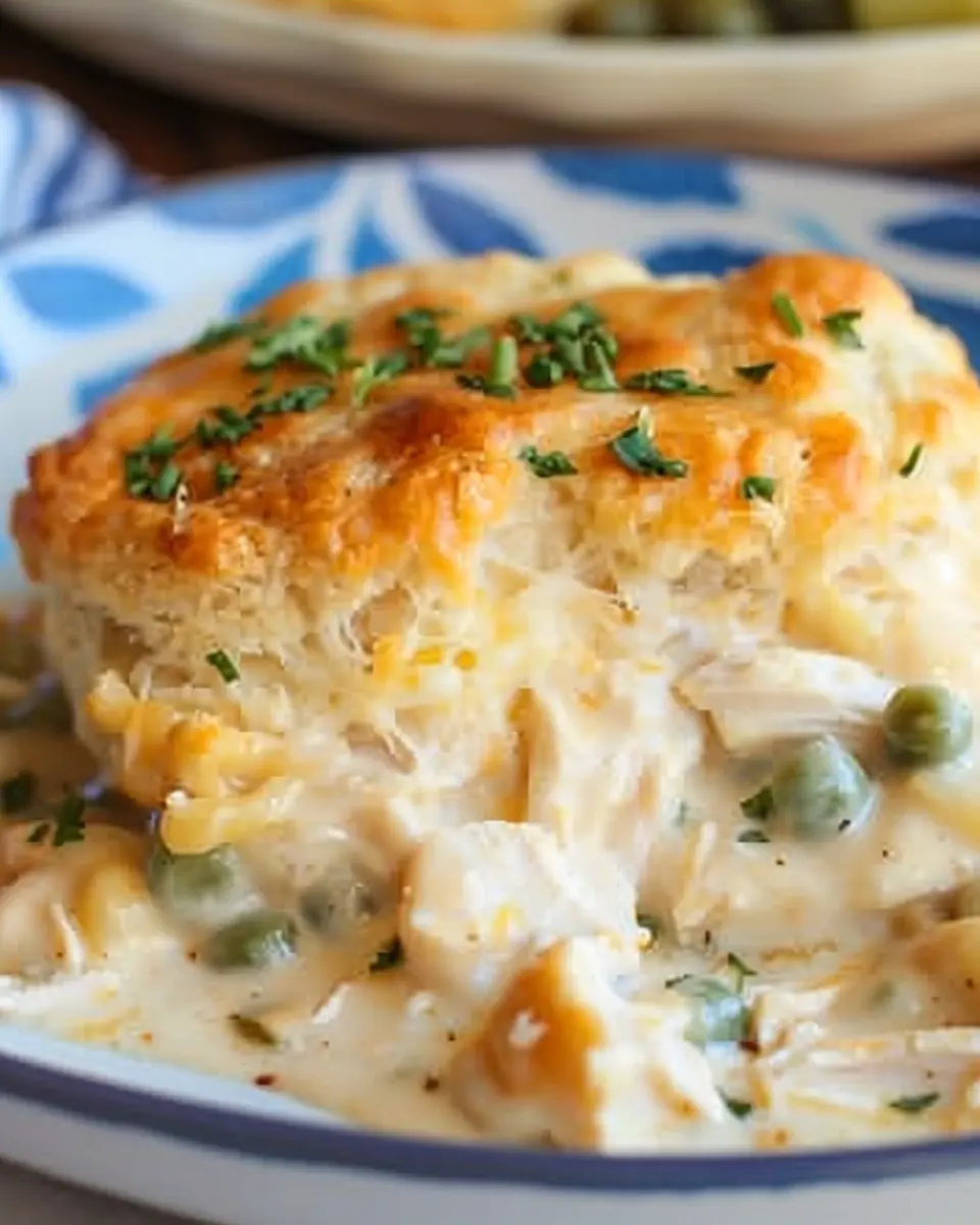 A comforting dish featuring creamy chicken served over fluffy biscuits.