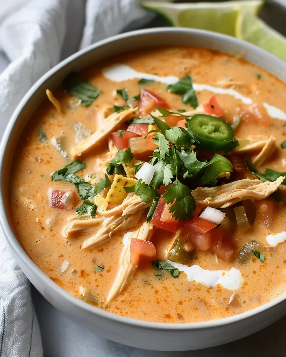 This creamy chicken tortilla soup is a comforting dish loaded with flavors, perfect for cold evenings.
