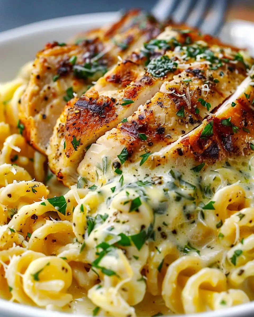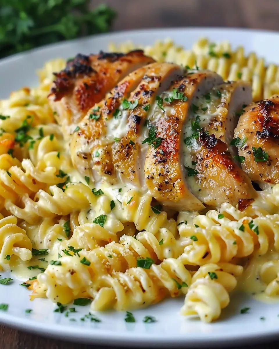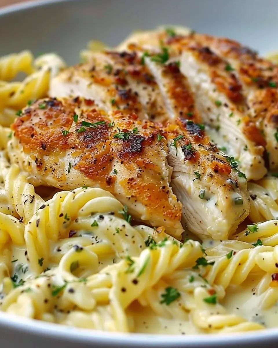 A rich and savory dish featuring tender chicken in a creamy garlic Parmesan sauce, paired with delicious twisted pasta.