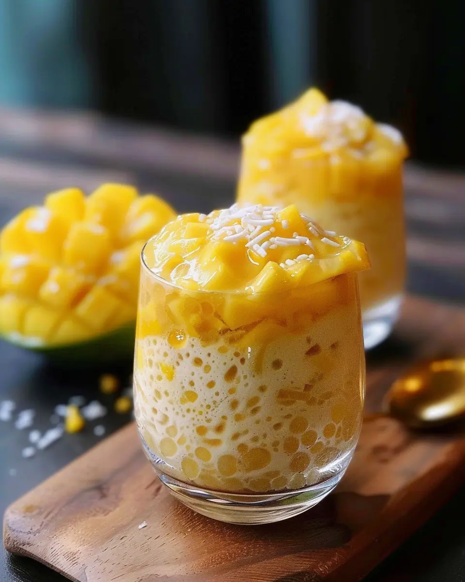 A delightful and creamy dessert that combines mango and sago for a tropical treat.