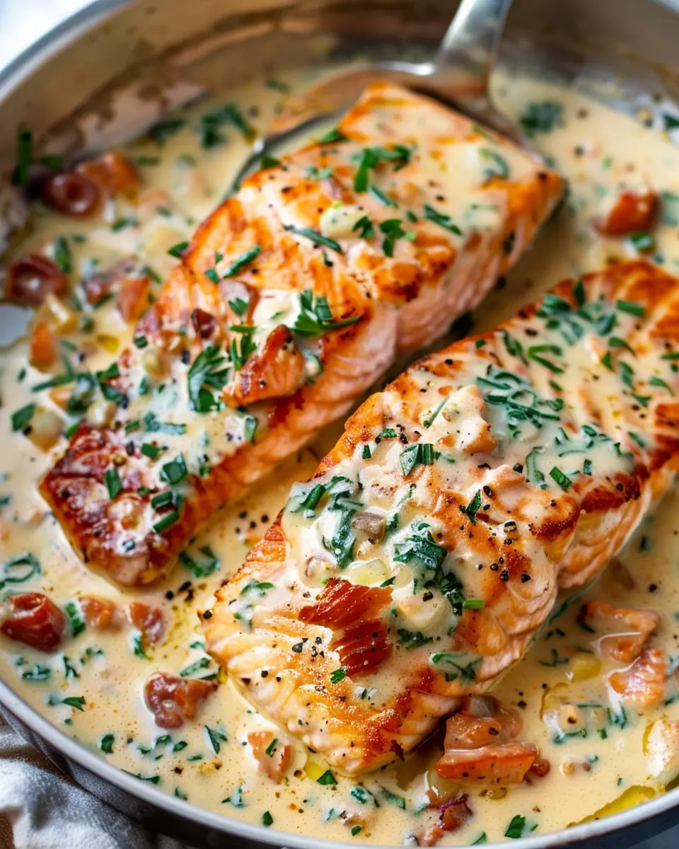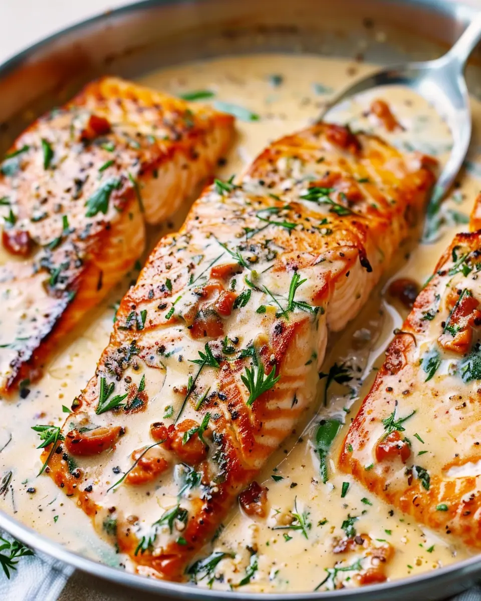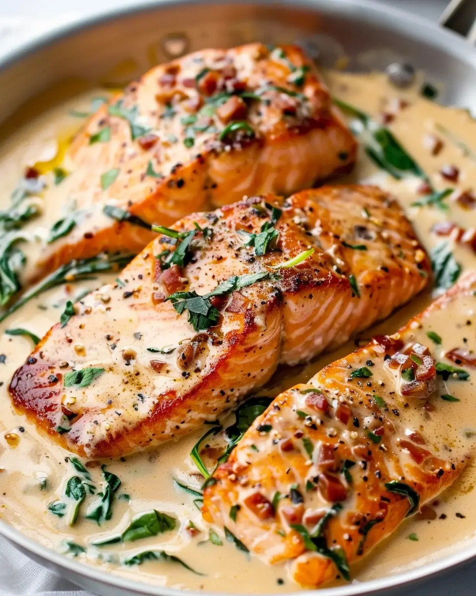 PrintCreamy Tuscan Salmon Recipe with Turkey Bacon: Easy and Delicious