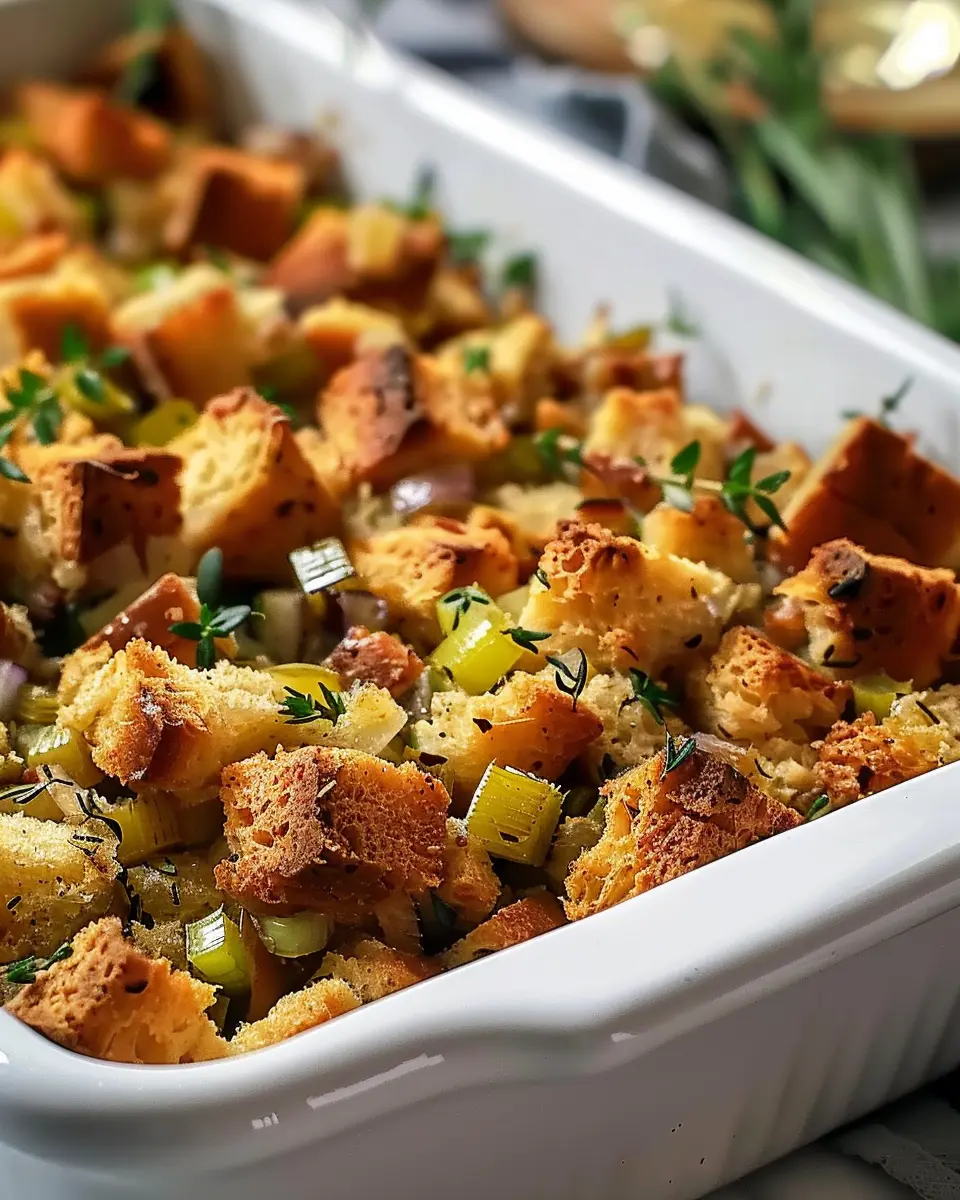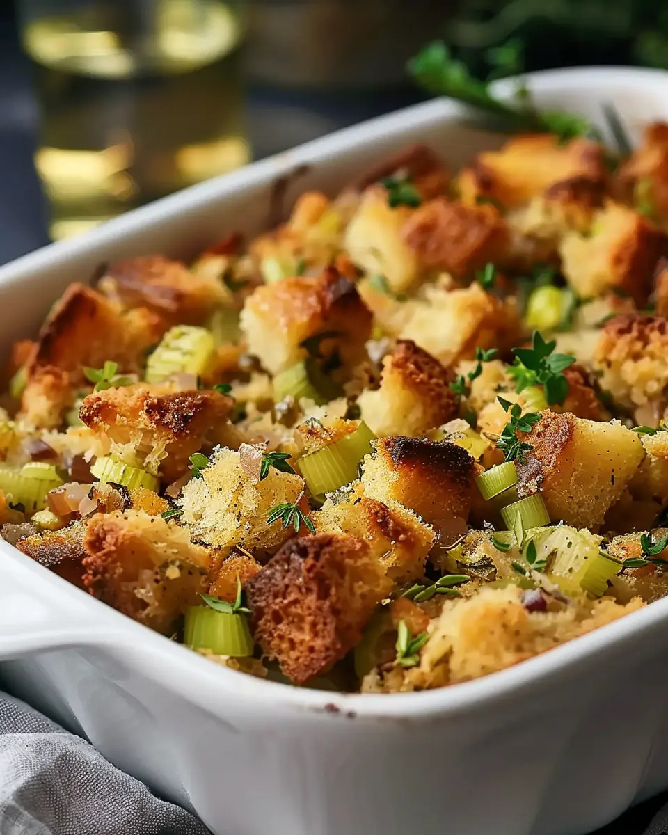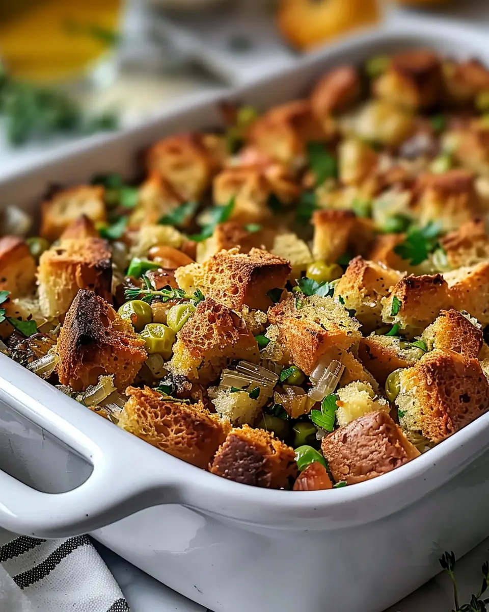 Now for the best part—serving! Once baked, allow the stuffing to cool slightly before scooping generous portions onto your plates. Pair it with turkey, cranberry sauce, and your favorite sides for a classic Thanksgiving feast.