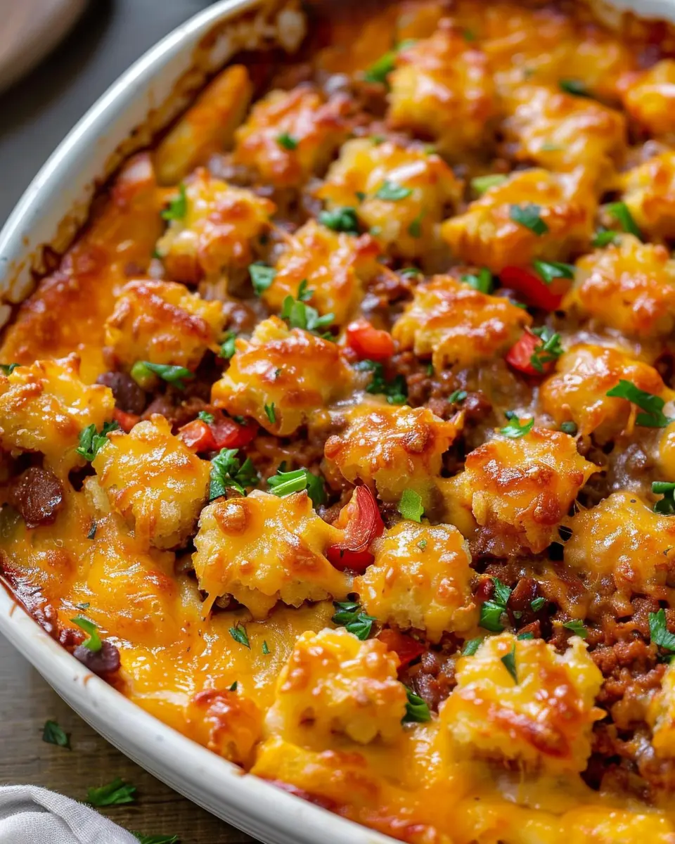 Preheat your oven to 350°F (175°C). While it’s heating up, grab a baking dish and start layering. First, spoon in the meat mixture evenly across the bottom. Then, place a layer of tater tots on top. Don’t worry about making it look perfect; rustic is the name of the game for this casserole!