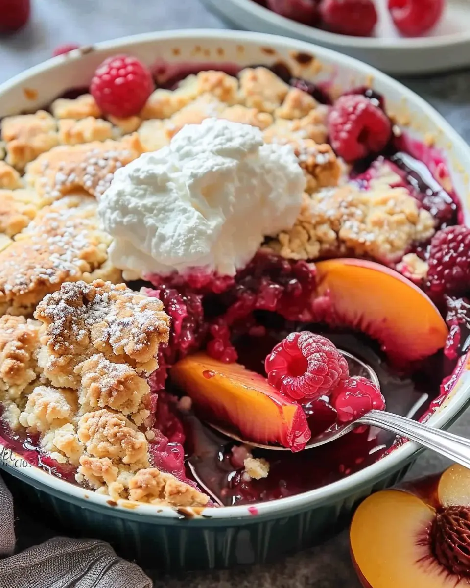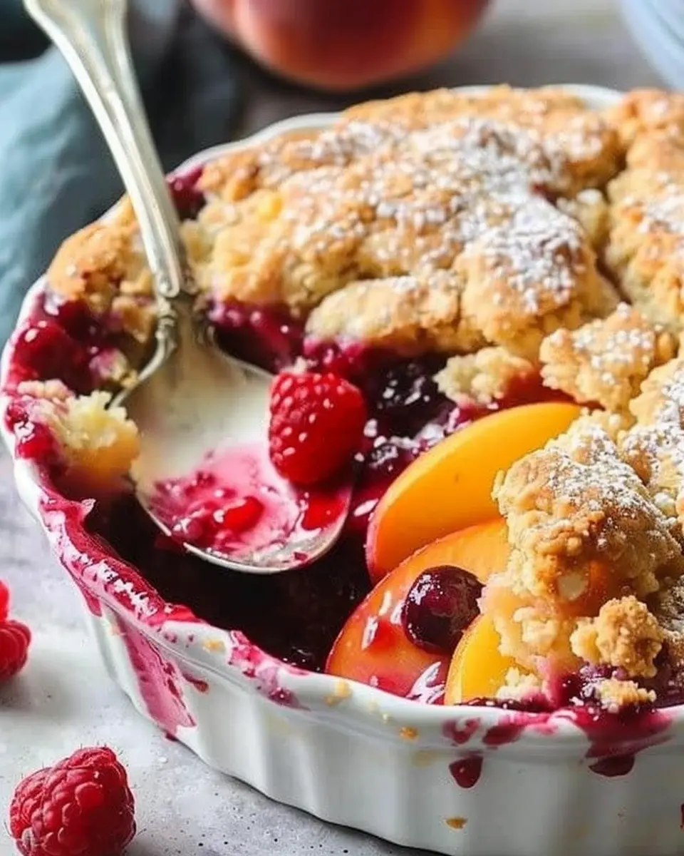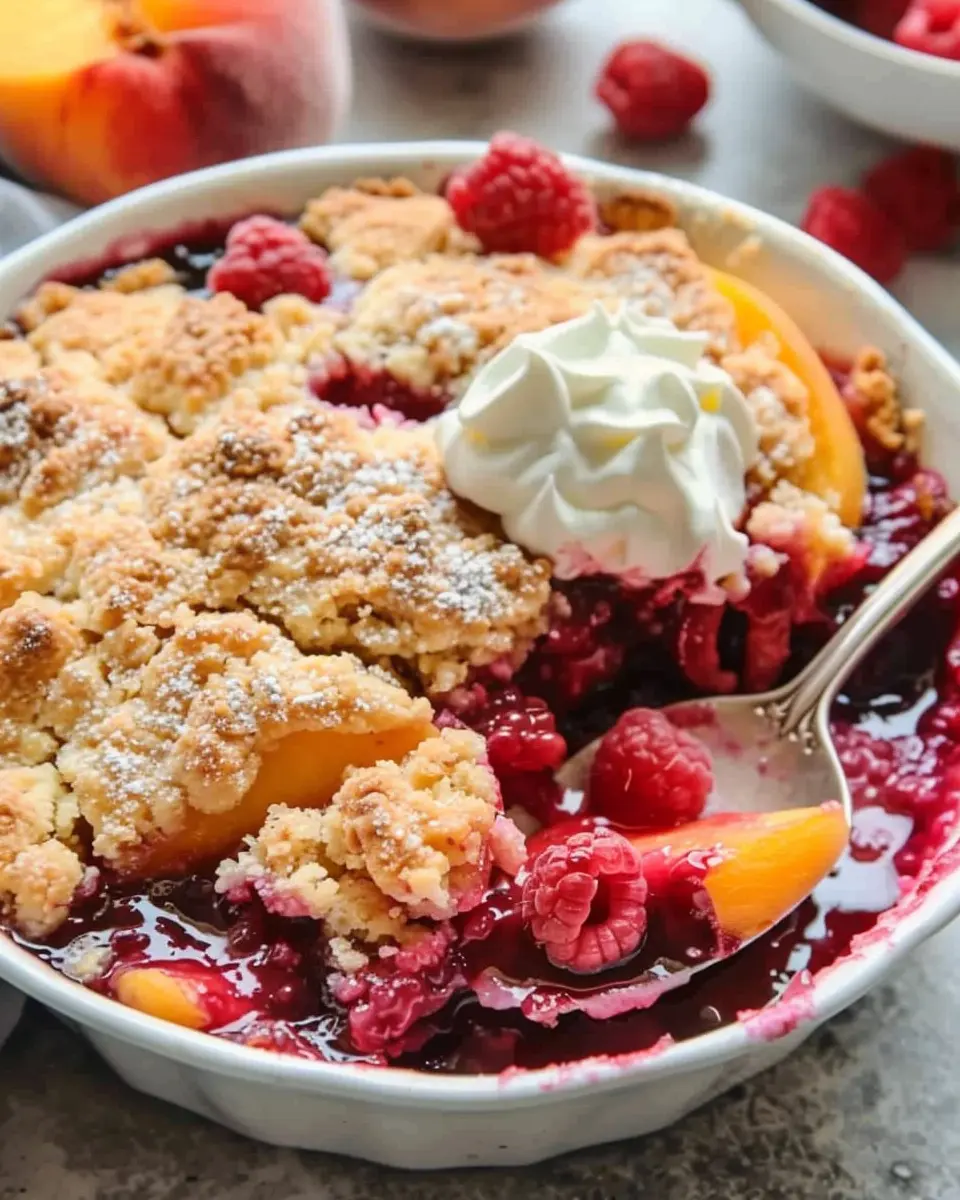 A delightful summer dessert featuring peaches and raspberries wrapped in a buttery cobbler crust.