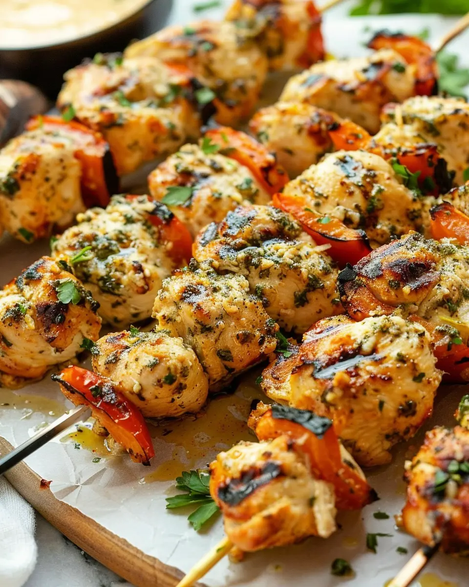 Succulent chicken skewers marinated in a flavorful garlic ranch parmesan sauce, grilled to perfection.