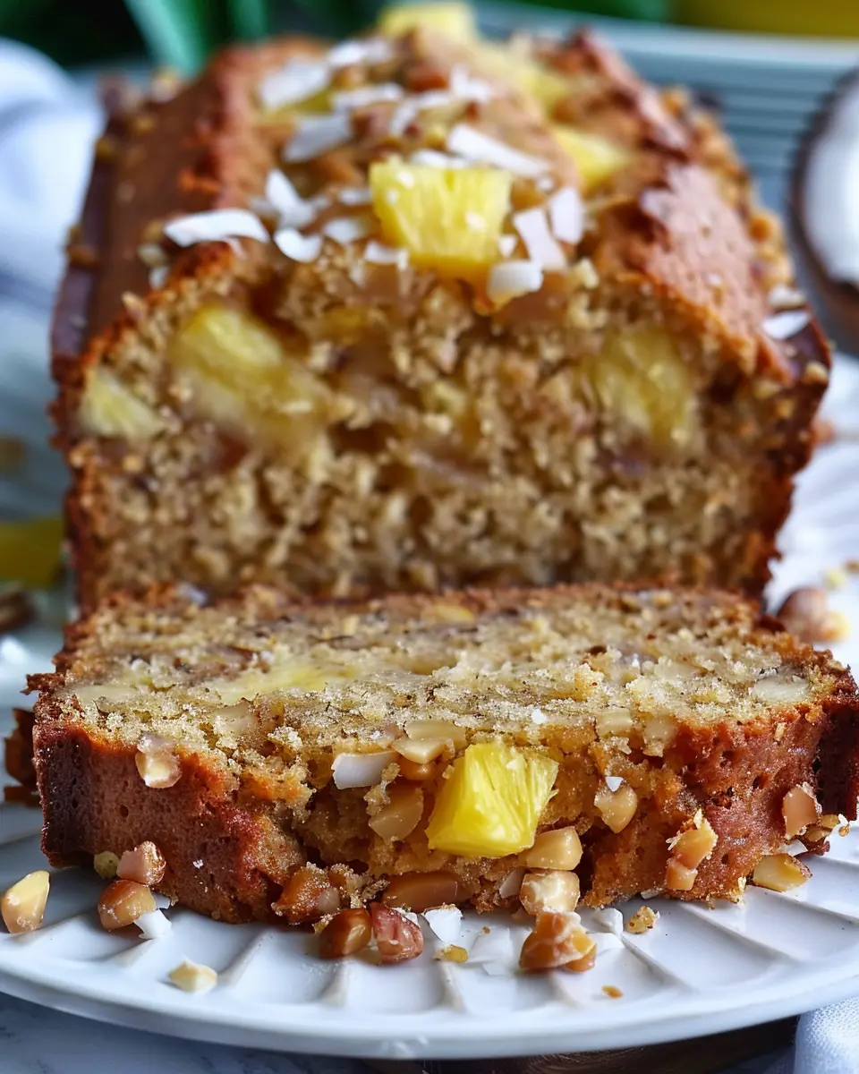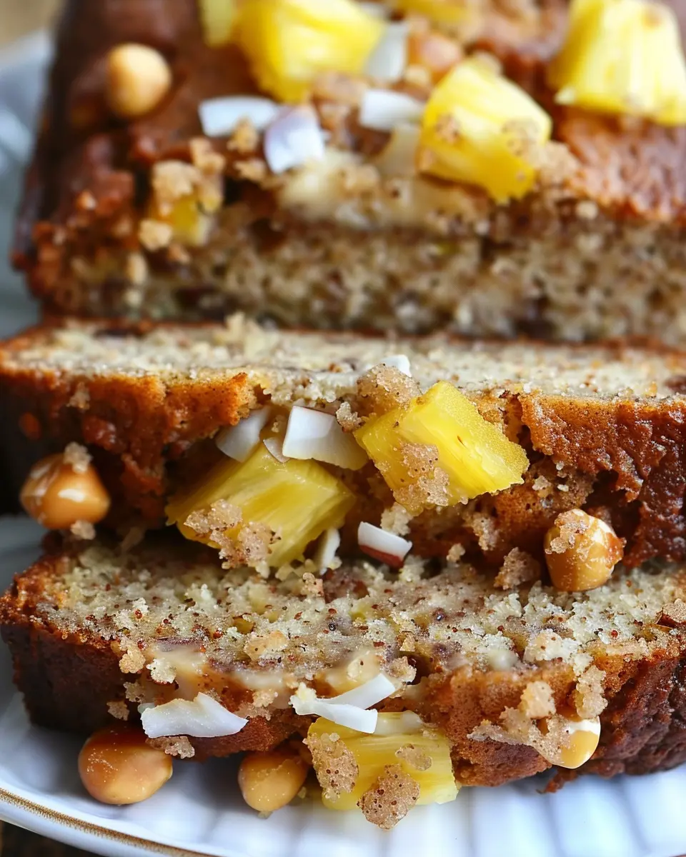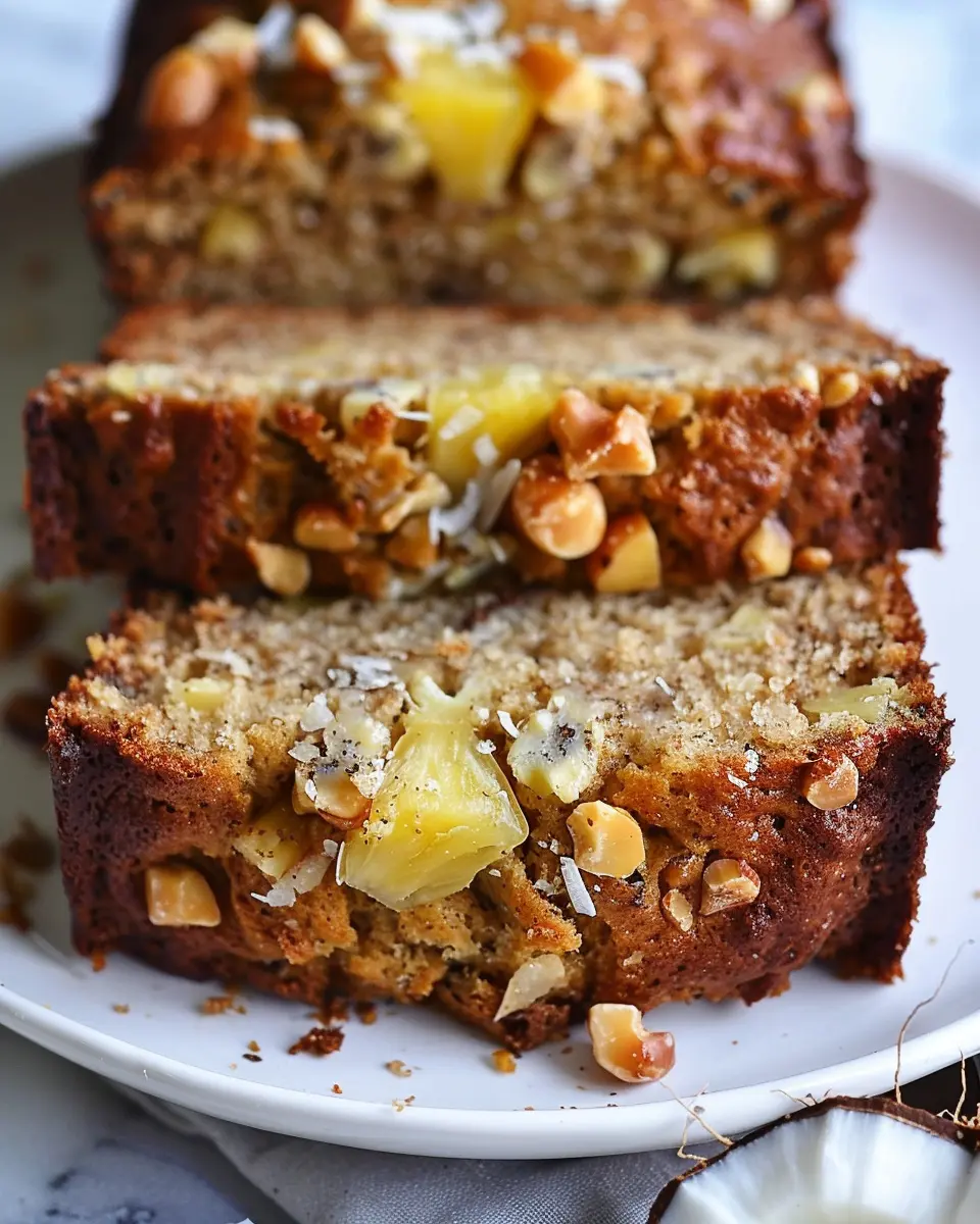 Enjoy a tropical twist on classic banana bread with the addition of pineapple, coconut, and macadamia nuts.