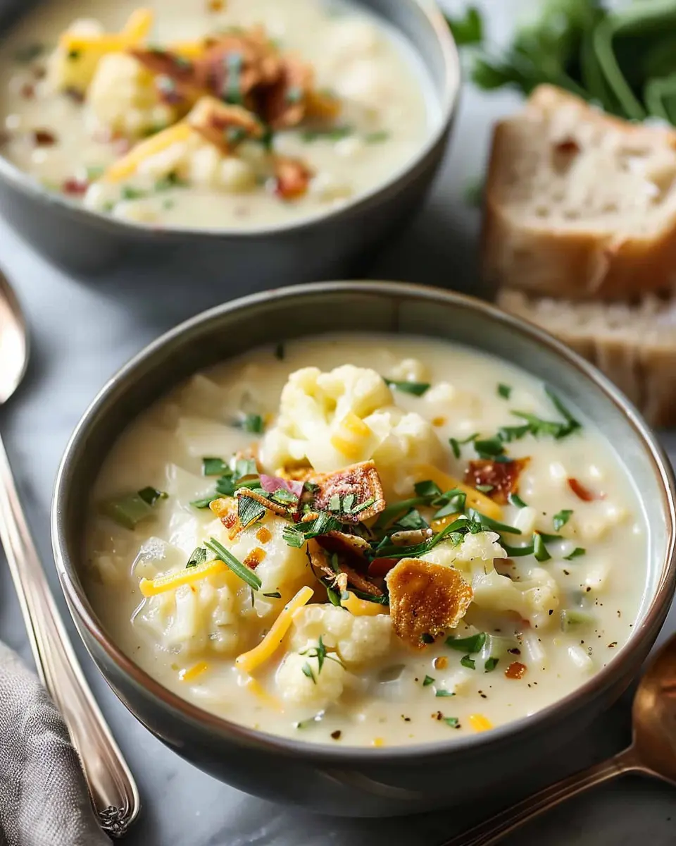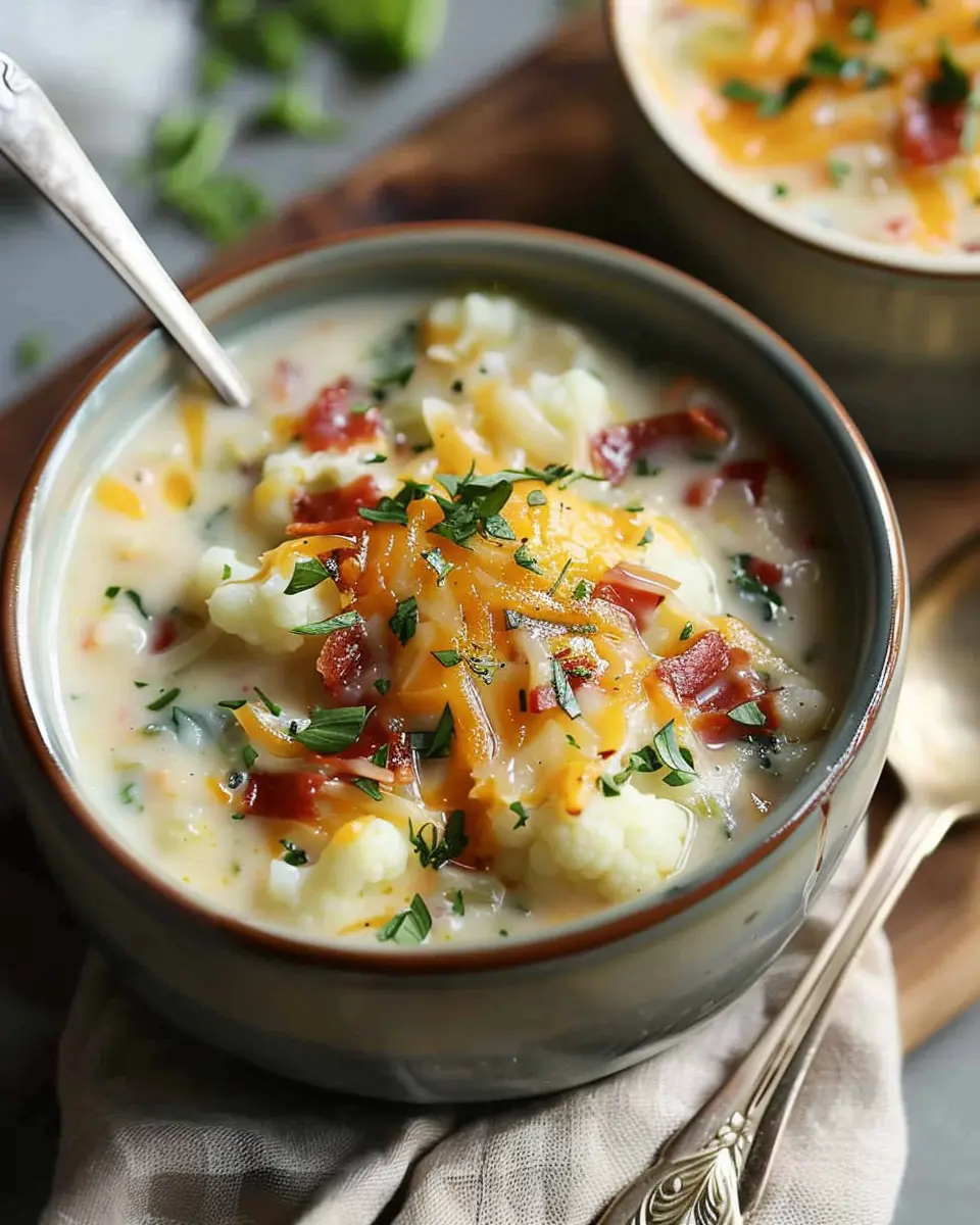PrintLoaded Cheesy Cauliflower Soup: Indulgent Comfort in a Bowl