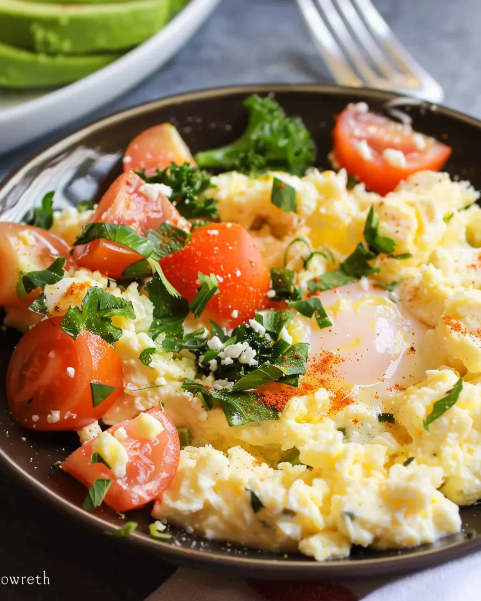 - Next, toss in the diced tomatoes and chopped spinach. Cook these vegetables for another 2-3 minutes or until the spinach wilts and the tomatoes soften slightly. This combination not only tastes great but also adds color and nutrients to your scramble.