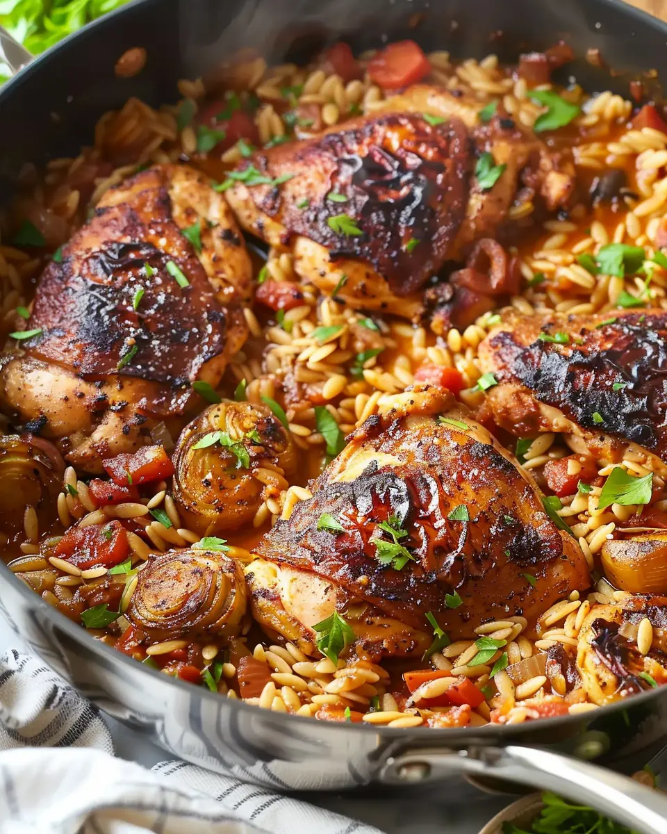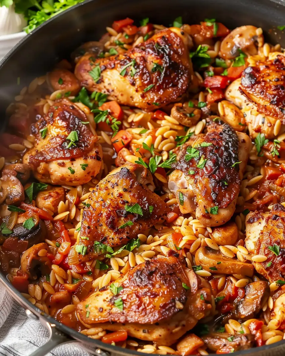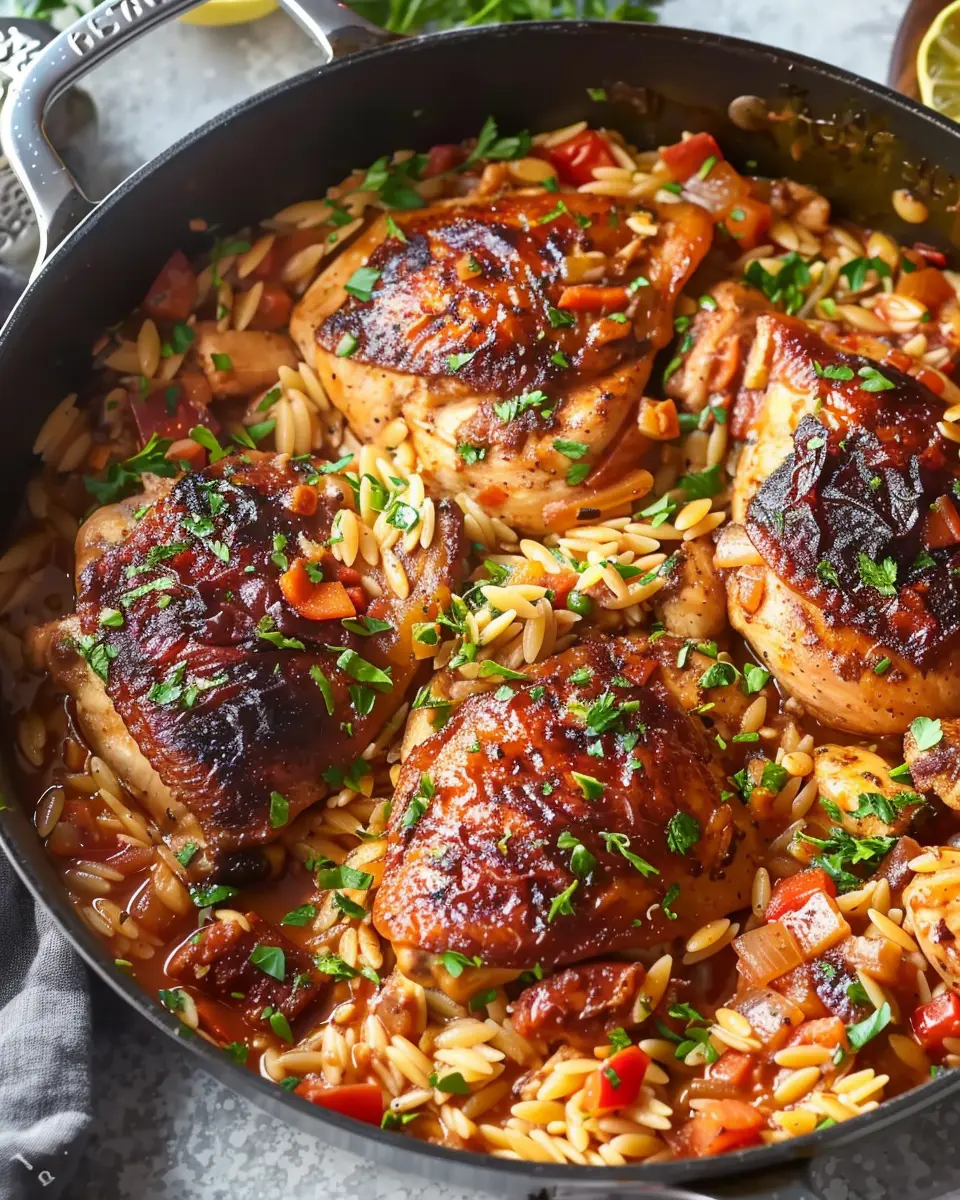 - Nestle the seared chicken back into the pot on top of the orzo. Cover and let everything simmer together for about 10 minutes, or until the chicken is cooked through and the orzo has a lovely al dente texture.