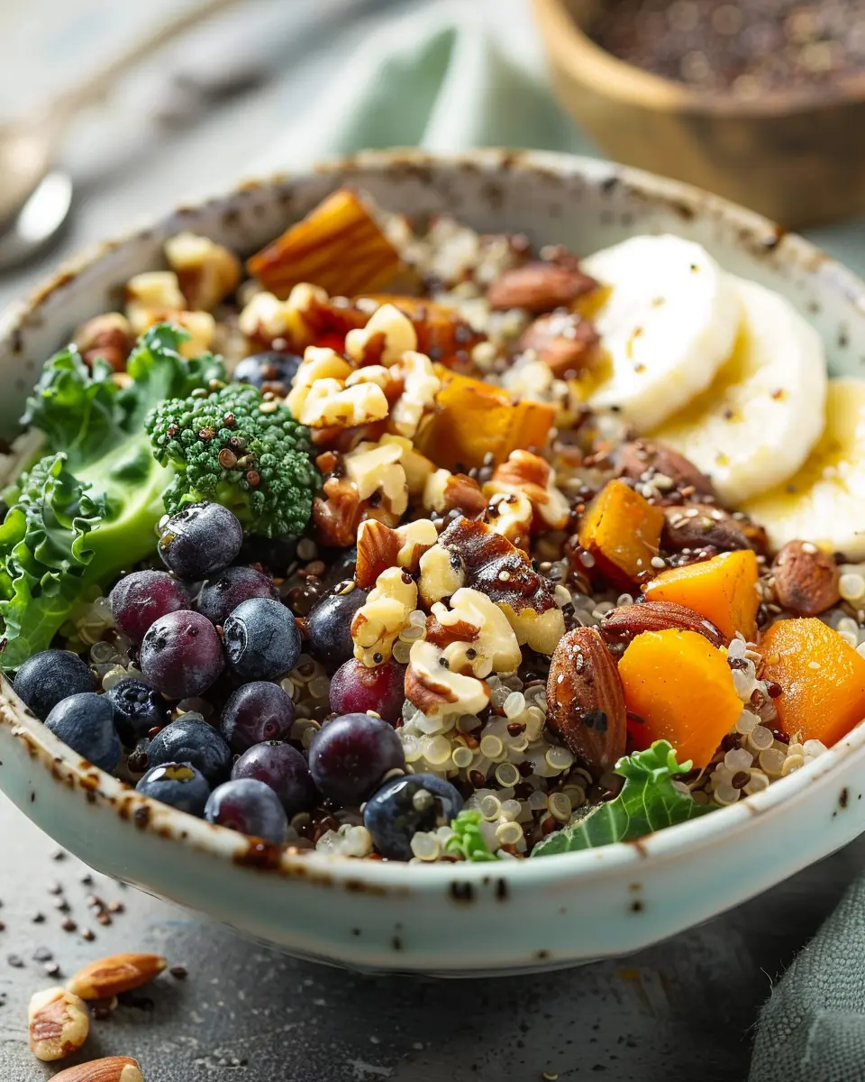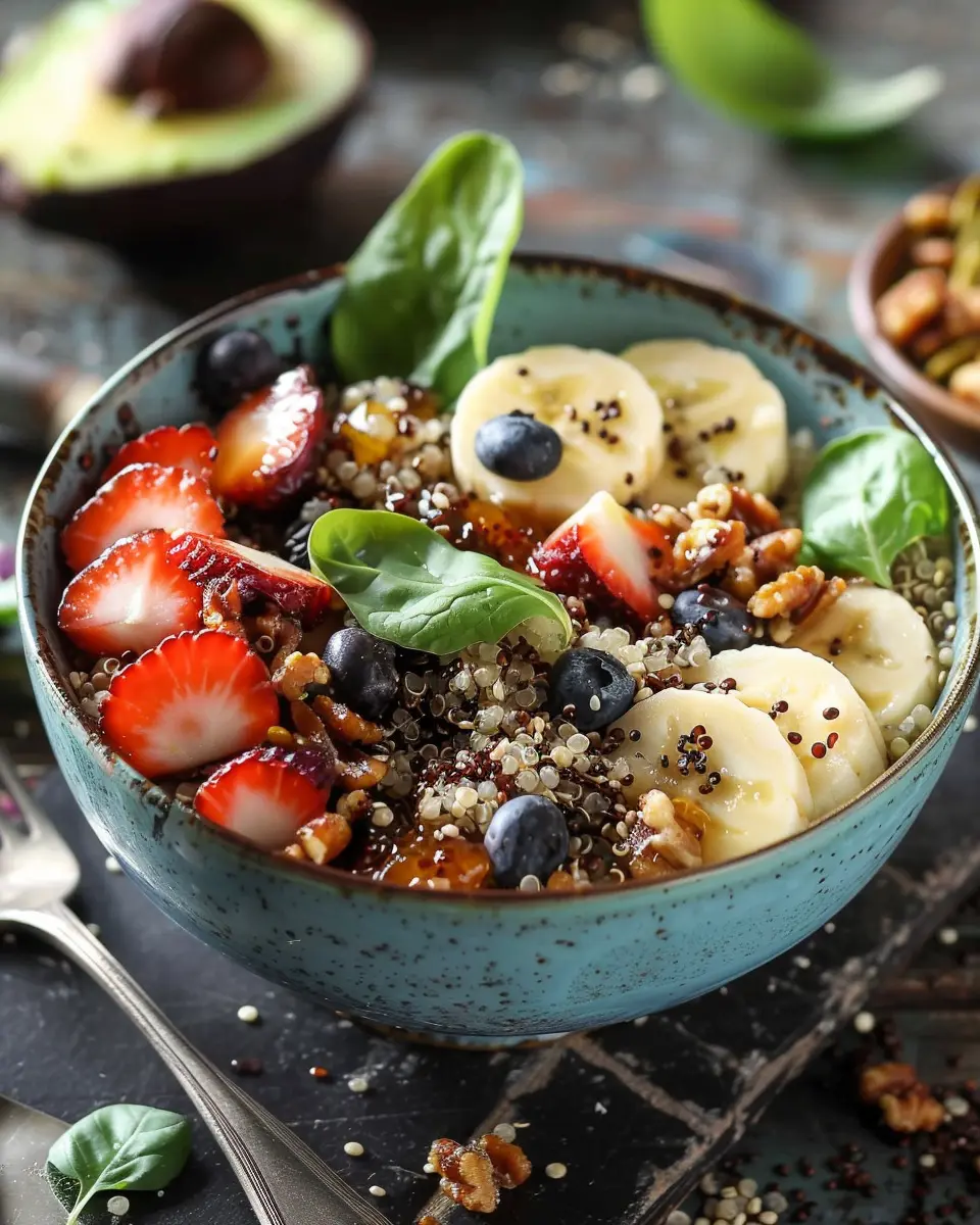 Now comes the fun part—toppings! Serve your quinoa in bowls and artfully arrange sliced bananas, fresh blueberries, and chopped walnuts on top. The bananas add natural sweetness, the blueberries are packed with antioxidants, and the walnuts give it a satisfying crunch. You can also sprinkle some cinnamon or shredded coconut for an extra burst of flavor.