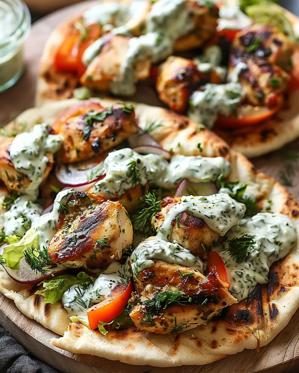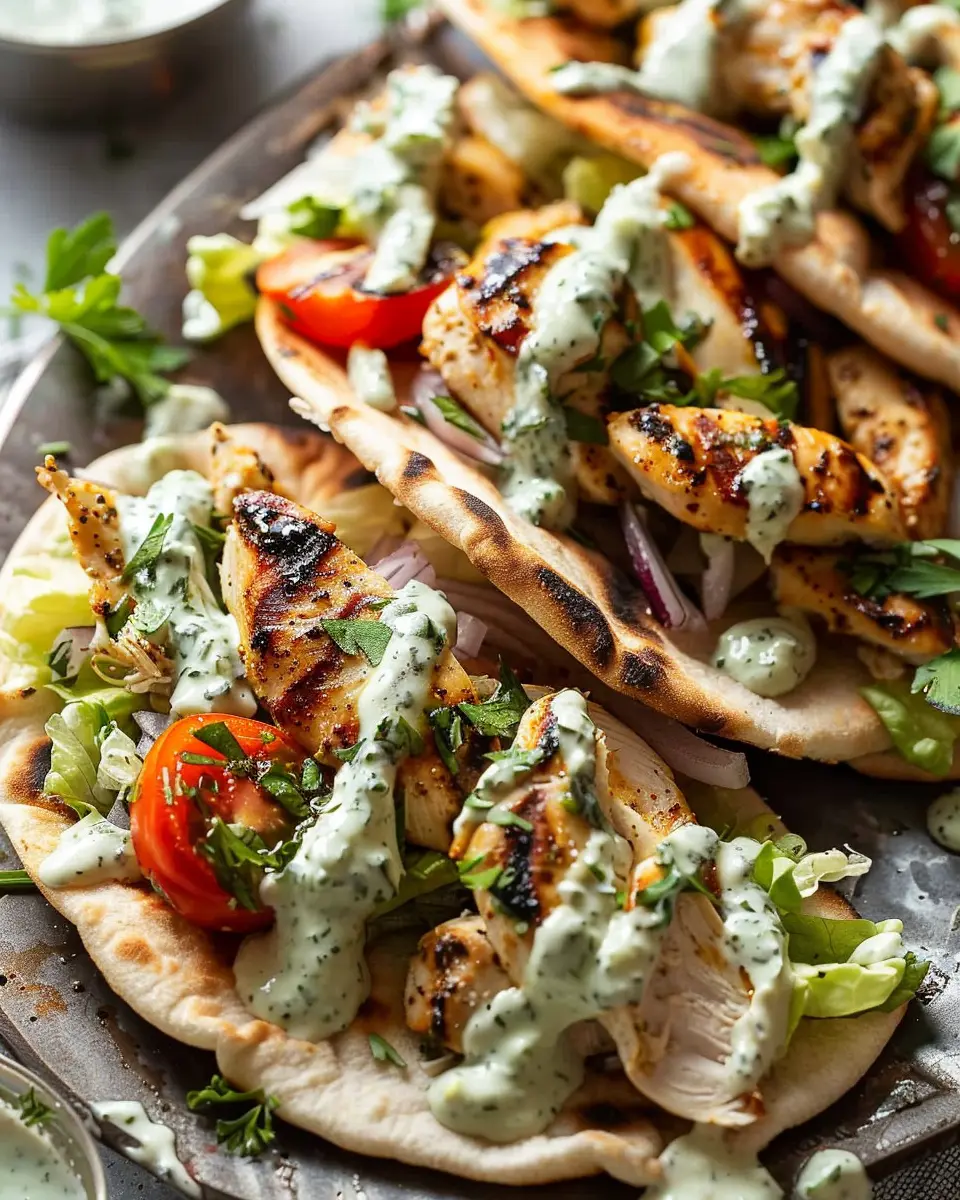 Enjoy a delightful meal with these Sheet Pan Chicken Pitas topped with zesty Herby Ranch, perfect for a family feast.