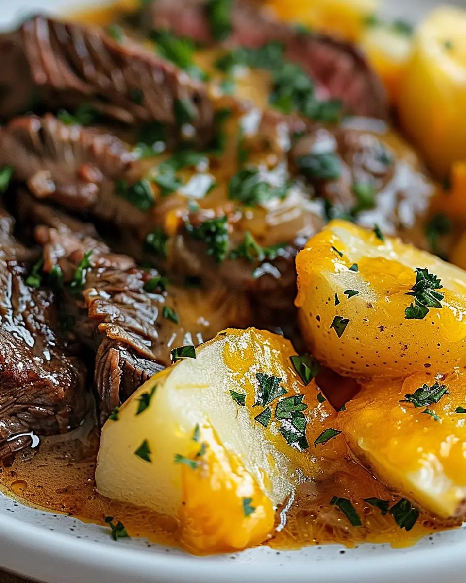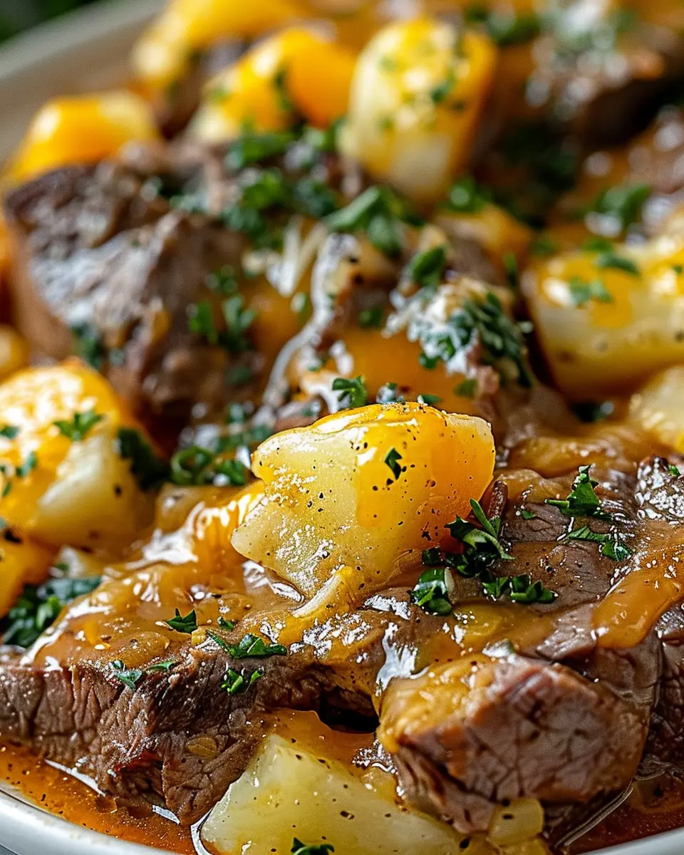A delicious and easy slow cooker recipe that combines tender steak, creamy cheddar cheese, and hearty potatoes.